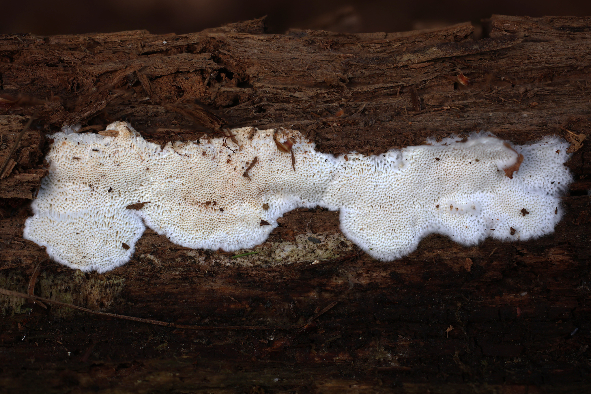 Etimologija: album (lat.) = bijelo + brunneus (lat.) = smeđe. Po kontrastu između bijelih rupica i smeđih cjevčica. Plodno tijelo: 3-40 cm široko i 1-18 mm debelo, posve prileglo na supstrat, razrašteno, formira plahtice, ponekad je većih dimenzija jer je više plodnih tijela zajedno spojeno; himenijalna je površina bijela do bijelo-sivkasta, zatim je krem do sivkasto-smeđa, često je s diskoloriranim cimetastosmeđim mrljama, po suhom je vremenu jednoličnije smeđa, u starosti je cimetastosmeđa, rub je pamučasto-dlakav, bijel, kasnije je smećkast do hrđastosmeđ. Rupice/cjevčice: Okruglaste, višekutne, 3-5/mm2, ponekad izduženi i šire, promjera do 1 mm, u samom subkulumu i na rubu, poslije su duguljasto-rascijepljene; cjevčice su 1-3 mm duge, najprije su bijele, kasnije su jednolično svijetlosmeđe. Spore: Valjkaste, glatke, prozirne, 4-8.5 x 1.3-2.4 µm, Q = 3-3.8 (cromushrooms: (4.6) 5 - 6.5 (7.5) × (1.3) 1.4 - 2 (2.3) µm, Q = (2.8) 3 - 4 (4.2), N = 60, Me = 5.9 × 1.7 µm, Qe = 3.5); otrusina je bijela. Meso: Tanko, mekano, po suhom je vremenu žilavo, bjelkasto; miris je cvijetni, na suhe jabuke, a okus je blag. Stanište: Raste tijekom godine kao saprofit krupnijih drvnih ostataka različitog crnogoričnog drveća s korom koji su izloženi suncu, obično jele, ariša, smreke, ili bora. Vrlo je rijetka vrsta. Slike su snimljene 11.3.2026., na lokalitetu Brlenić kod Krašića, na trupcu bora. Doba rasta: 1, 2, 3, 4, 5, 6, 7, 8, 9, 10, 11, 12 Status jestivosti: NEJESTIVA - Nema vrijednosti. Napomena: Po pamučastoj rubnoj zoni i rupičastoj himenijalnoj površini slična je svilenasta koroporka (Anomoporia bombycina). Referentni izvori: Božac, Romano. 2008. Enciklopedija gljiva, 2. svezak. Školska knjiga. Zagreb. – 1312. Antrodia albobrunea (Romell) Ryv. Skeniraj QR kod za brzi pristup ovoj vrsti na svom mobitelu.