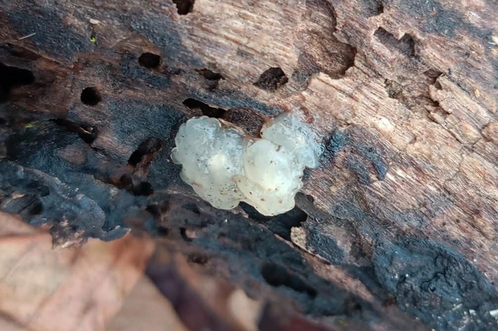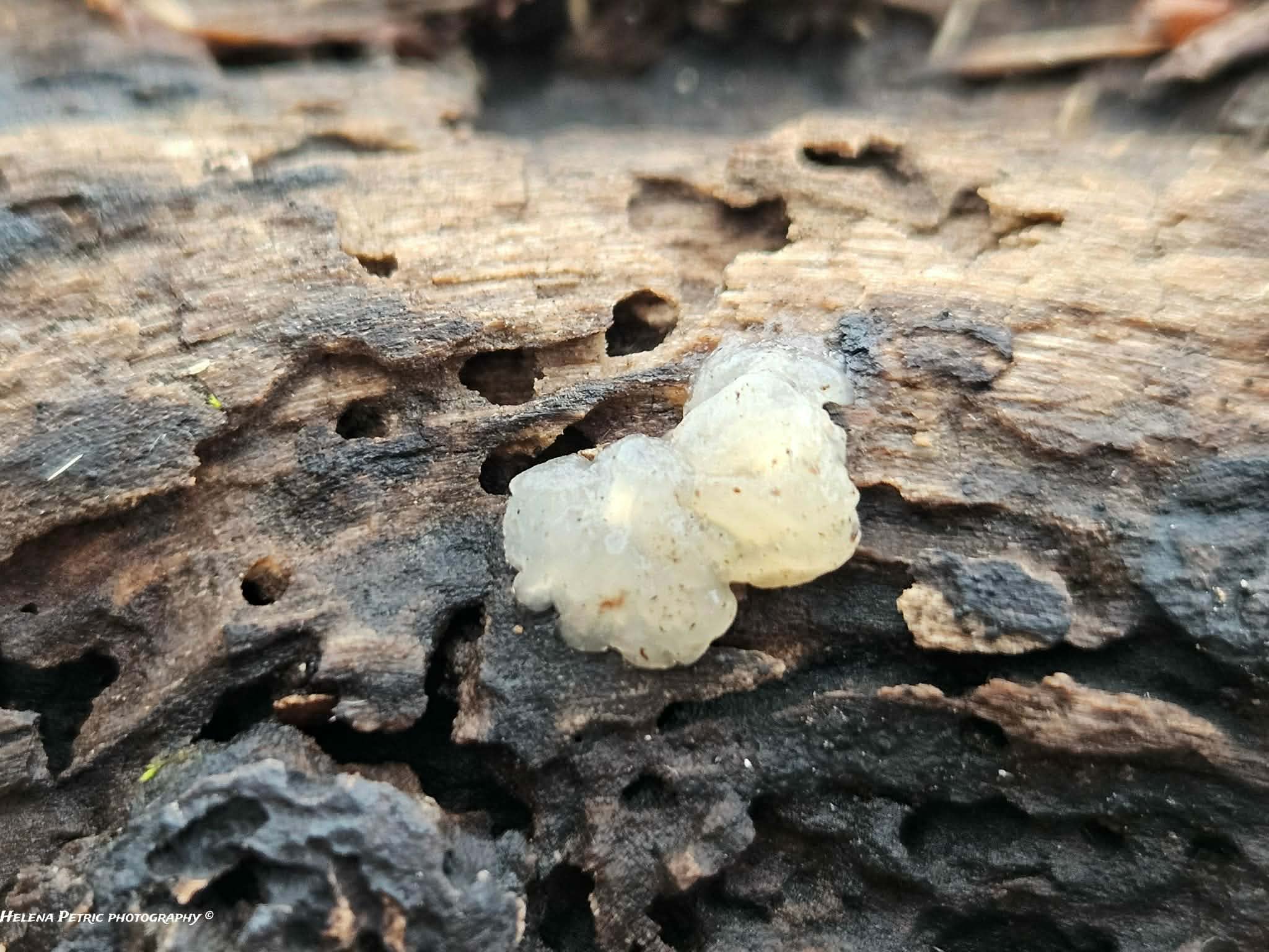 Etimologija: nucleus (lat.) = jezgra, sredina, središte. Po kristaličnoj unutrašnjosti plodnog tijela. Engleski naziv: Crystal Brain Plodno tijelo: 1-3 (5) cm široko, jastučasto ili je u obliku grudve, ponekad teži da se stapa s drugim plodnim tijelom, u unutrašnjosti se nalazi bijela do žućkasta štapićasta do jajolika jezgra od bijelih prozirnih vapnenačkih kristalića; prozirno, bjelkasto, kasnije je okerasto do smeđe, isušeno na supstratu je blistavo i smećkasto. Spore: Eliptične, prozirne, 8-14 x 3-5.5 µm, Q = 2.3-2.7 (cromushrooms: spore su (8) 8.5 - 11.4 (12.6) × (3.4) 3.7 - 4.9 (5.2) µm, Q = (1.9) 2.1 - 2.7 (3.3), N = 60, Me = 9.8 × 4.3 µm, Qe = 2.3, bazidije su 4-sporne, eliptične, 11-17 × 7.4-10 µm, N = 13, hife su 1-3.2 µm, s kopčama); otrusina je bijela. Meso: Vodenasto-želatinozno, mekano, prozirno; miris nije izražen, a okus je blag. Stanište: Raste u proljeće, ljeto i jesen, u skupinama, u bjelogoričnim i aluvijalnim šumama kao saprofit krupnijih drvnih ostataka bjelogoričnog drveća; u povoljnim atmosferskim uvjetima naraste dosta velika. Slike su snimili Helena Petrić i Slobodan Bjelajac, 7.2.2026., na lokalitetu Samoborsko gorje. Doba rasta: 5, 6, 7, 8, 9, 10, 11 Status jestivosti: NEJESTIVA - Nema vrijednosti. Napomena: Prisutna je jezgra od kristalića po čemu se ova gljiva razlikuje od vrsta iz rodova Tremella ili Exidia. Ponekad je jezgra teško uočljiva pa se često zamijeni s thuretianovom drhtalicom (Exidia thuretiana). Bazidiji su karakteristično stapčasti što uvijek ukazuje na pripadnost rodu Myxarium.