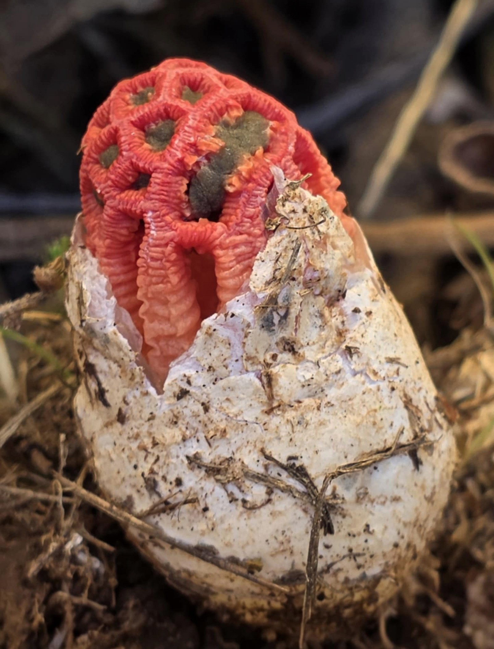 Etimologija: hirudo, hirudinis (lat.) = pijavica, medicinska pijavica, nalik pijavici. Po krvavocrvenoj boji. Plodno tijelo: 4-6 cm visoko i 2-3 cm široko, u početku je kuglasto ili jajoliko, promjera 1.5-2.5 cm, egzoperidij je gladak, bjelkast do svijetloružičast, pričvršćenog s bijelim korjenčićima, ovoj razvojem puca, pri čemu se pojavljuje struktura nalik kavezu, sastavljena od 4-8 zakrivljenih krakova koji se spajaju u lažni stručak na bazi unutar volve, krakovi su široko rašireni do vrha, na vrhu naglo prelazi u mrežu s malih očicama, krakovi su obično tamnocrveni blizu vrha, prema bazi postaju svjetliji, narančasto-crvenkasti, ružičasti ili svijetlonarančasti, unutarnja površine kaveza prekrivene su smrdljivom, maslinastom do maslinasto-smeđom, sluzavom glebom. Spore: Valjkaste do eliptične, glatke, prozirne, 4.5-6 x 1-2 µm, sferocistide su gotovo kuglaste, kruškolike ili nepravilne, glatke, 9-43 µm, hife volve su glatke, višesegmentne, široke 1-4 µm ponekad su razgranate, kopče nisu prisutne; otrusina je smeđa. Meso: Spužvasto, crveno; miris je jak i neugodan po strvini, a okus je blag. Stanište: Raste tijekom godine, pojedinačno ili u skupinama, u šumama, vrtovima, po šumarcima, stazama ili na obrađenim područjima, u Europi je rasprostranjena u mediteranskom području. Slike je snimila Ivana Mandić Mihaljević, 22.1.2026., na lokalitetu Javna ustanova Kamenjak kod Pule. Doba rasta: 1, 2, 3, 4. 5, 6, 7, 8, 9, 10, 11, 12 Status jestivosti: NEJESTIVA - Nejestiva je vrsta zbog veoma neugodnog mirisa. Napomena: Raset prvenstveno u mediteranskom području i iznad zdepastog stalka tvori strukturu koja sliči na kavez. Ima 4-8 prilično široko razmaknutih krakova, a na vrhu se naglo razvija mreža s manjim očicama. Može se zamijeniti s vještičinim srcem (Clathrus ruber), koja je većih dimenzija i nešto drugačije građenim kavezom.