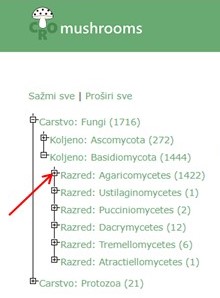 NAMPOMENA: Kod pregledavanja i širenja taksonomskih stavki na lijevom dijelu stranice mišem se pozicionirajte na + znakove koji se nalaze lijevo od naziva određene taksonomske stavke, kao što prikazuje crvena strelica na slici ispod. Ako kojim slučajem odaberete izravno taksonomsku stavku stranica će otvarati onoliko vrsta koliko je navedeno u zagradi što u slučaju prevelikog broja može dovesti do zamrzavanja ili blokiranja stranice. Kod broja manjeg od 100 se ne očekuju nikakve poteškoće.