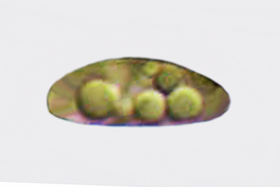 | Hyalorbilia inflatula | Izduženo vretenaste, zakrivljene, glatke, prozirne, 5.8-6.5 x 0.9.-1.1 µm, Q = 5.6 - 7.2, N = 9, Me = 6.2 x 1 µm Qav = 6.6; otrusina je svijetložuta. |  |