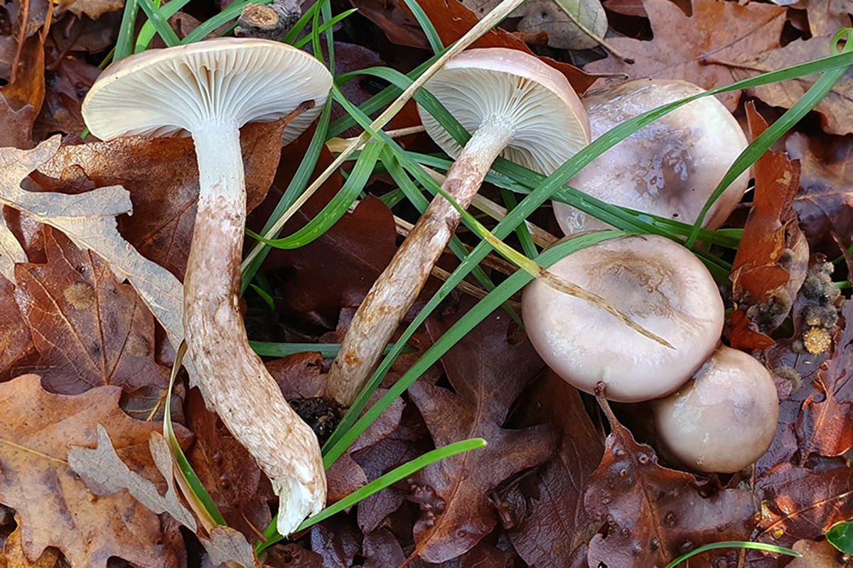 Etimologija: glutinosus (lat.) = ljepljiv, sluzav + -fer (lat.) = koji nosi, koji ima. Po ljepljivoj i sluzavoj površini plodnog tijela. Klobuk: 3-8 cm širok, najprije je polukuglast, zatim se raširi i često tupo ispupči na sredini, površina je mazava i sluzava, smeđ, sivo-maslinast do tamnosmeđ. Stručak: 4-12 cm visok i 0.6-1.5 cm debeo, valjkast, površina je mazava i ljepljiva, na vrhu je bijelo pahuljast, ispod je prošaran sluzavim oker do smeđim ljuskama poput zmijske kože na bijeloj osnovi. Listići: Razmaknuti, jasno se spuštaju po stručku, bijeli, kasnije su sa smećkastom nijansom. Spore: Eliptične, 9-12 x 5-7 µm; otrusina je bijela. Meso: Mekano, bijelo; miris i okus nisu izraženi. Kemijske reakcije: Kožica klobuka s KOH postane zeleno-plava. Stanište: Raste u ljeto i jesen, od kolovoza do studenog, u bjelogoričnim šumama, uglavnom u simbiozi sa hrastom crnikom ili plutnjakom, na glinenastom tlu. Prve dvije slike snimio je Neven Ferenčak, 2.11.2024., treću Ivana Mandić Mihaljević, 14.12.2019., a četvrtu i petu mirna Katičić, 19.10.2024. Doba rasta: 8, 9, 10, 11 Status jestivosti: JESTIVA - Jestiva je vrsta slabe kvalitete. Napomena: Ova puževica raste ispod hrasta, male je veličine, a klobuk i stručak su oker boje. Slične su Korhonenova puževica (Hygrophorus korhonenii), koja raste ispod smreke, a reakcija kožice klobuka s KOH je negativna, maslinastobijela puževica (Hygrophorus olivaceoalbus), koja raste ispod smreke, stručak s natrijevim hidroksidom (NaOH)) postane narančasto-crven, te viskozna puževica (Hygrophorus latitabundus), koja raste ispod bora, a stručak s natrijevim hidroksidom (NaOH)) postane žuto-oker. Opisana vrsta se prema radu Hygrophorus sect. Olivaceoumbrini: new boundaries, extended biogeography and unexpected diversity unravelled by transatlantic studies svrstava u sekciju Olivaceoumbrini i prema kojem su vrste Hygrophorus dichrous i Hygrophorus persoonii zapravo sinonimi opisane vrste. Referentni izvori: Božac, Romano. 2008. Enciklopedija gljiva, 2. svezak. Školska knjiga. Zagreb. – 926. Zmijolikonoga puževica (Hygrophorus dichrous Kühn. et Romagn.) Skeniraj QR kod za brzi pristup ovoj vrsti na svom mobitelu.