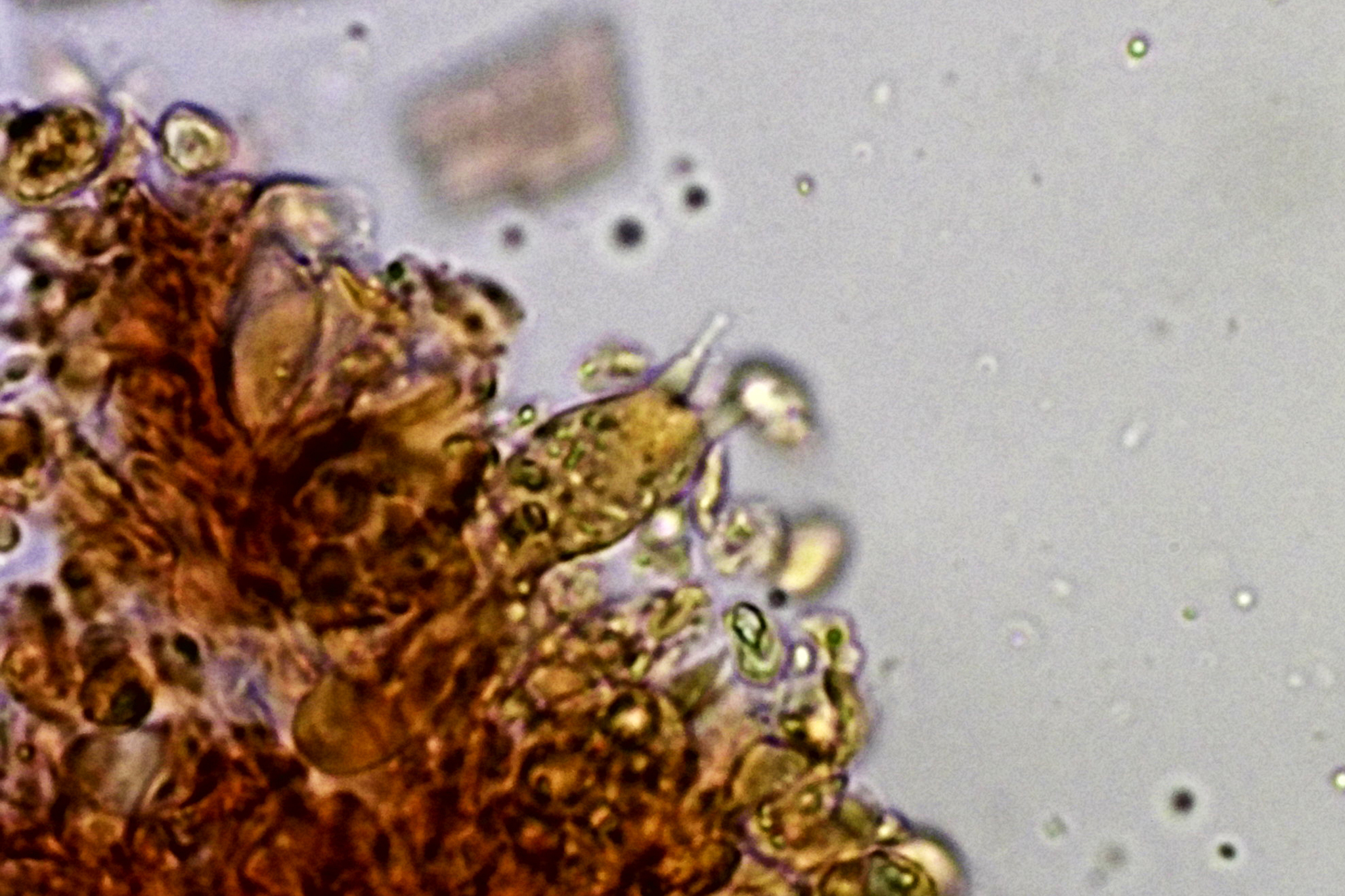 Spore: Eliptične, prozirne, glatke, amiloidne, 8-10.5 x 5.2-7.5 µm, Q = 1.2-1.6, Qav = 1.3-1.4, bazidije su 4-sporne, 30-40 x 8-10 µm, cheilocistide su vretenaste, u obliku boce, mjehuraste, valjkaste ili nepravilnog oblika, 19-60 x 5-11 µm, glatke ili s nekoliko neravnomjerno raspoređenih izraslina na vrhu ili bočno (cromushrooms: spore su (8) 8.2 - 9.9 (10.6) × (5.3) 5.9 - 7.3 (7.7) µm, Q = (1.2) 1.3 - 1.5 (1.6), N = 100, Me = 8.9 × 6.6 µm, Qe = 1.4, bazidije su 29-37 × 8.5-12.9 µm, N = 8, cheilocistide su 34-49 × 7-9.4 µm, N = 5); otrusina je bijela.