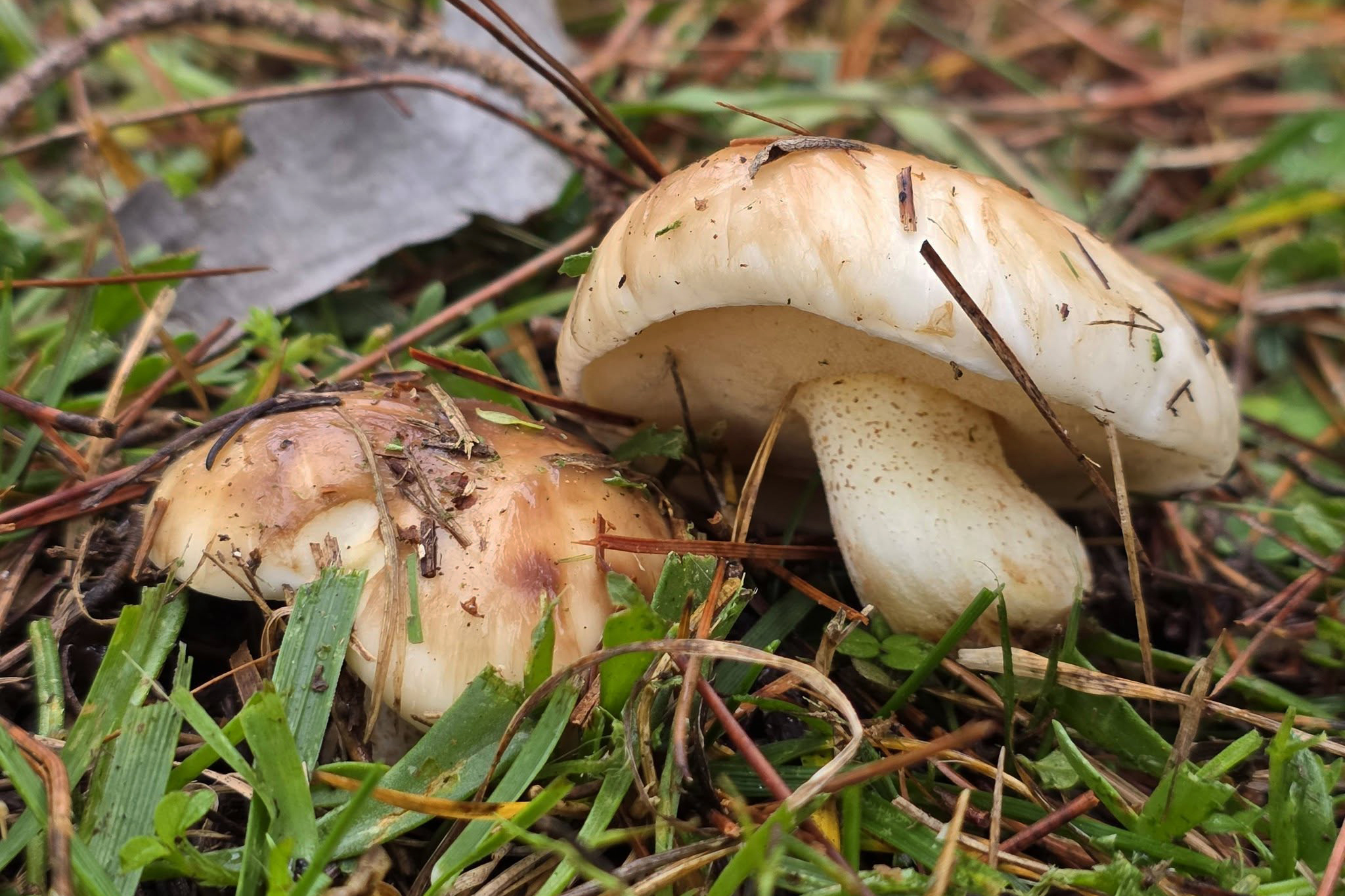 Engleski naziv: Champagne Bolete Klobuk: 4-10 (13) cm širok, prvo je konveksan, kasnije se raširi, sluzav, mazav, kožica se lako guli; u mladosti je bjelkast, kasnije je žućkast, u starosti je tamnije tamnosmeđe ili ljubičasto-smeđe boje, kožica na rubu izbljeđuje. Stručak: 2-5 (6) cm visok i 1-1.5 (2) cm debeo, izgleda kao produžetak klobuka, nema oštre granice između njih, kraći je od promjera klobuka, valjkast, na bazi je zašiljen, nekad je zakrivljen; bjelkast, pri dnu je žućkast, u mladosti je s istaknutim crvenkastim, a u starosti smeđim do crvenkasto-smeđim žljezdastim zrncima i mrljama koje su najuočljivije kada se gljiva razvije. Rupice/cjevčice: Višekutne, prilično su sitne, žute, u mladosti se na površini se nalaze mliječnobijele gutacijske kapljice koje oksidiraju na zraku i postanu hrđastosmeđe pa rupice postanu žuto-hrđastosmeđe; cjevčice su prilično kratke, spuštaju se po stručku, bjelkaste, kasnije su žute, u starosti su žuto-narančaste. Spore: Vretenaste, 7.5-10 x 3.8-4.5 µm; otrusina je žuto-oker. Meso: Osrednje je čvrstoće, brzo postane spužvasto, vodenasto, bijelo, u dnu stručka je žućkasto; miriše na voće, ponekad nije izražen, a okus je ugodan, lagano je slatkast. Stanište: Raste u ljeto i jesen po crnogoričnim šumama, najčešće u simbiozi s petoigličastim borovima (primjerice Pinus cembra i Pinus strubus), češći je u mediteranskom području. Slike je snimila Ivana Mandić Mihaljević, 14.9.2024. i 9.12.2025. Doba rasta: 8, 9, 10 Status jestivosti: JESTIVA - Jestiva je vrsta slabe kvalitete. Biti na oprezu jer sluz kod osjetljivih osoba može uzrokovati gastrointestinalne probleme ili u većim količinama djelovati laksativno. Sluzavci koji rastu u mediteranskom području često izazivaju alergijske reakcije. Napomena: Ovaj vrganj raste ispod borova, osobito uz morsku obalu. Ponekad dosta sliči ljupkom sluzavcu (Suillus placidus), osobito po svijetlom i pustenastom stručku.