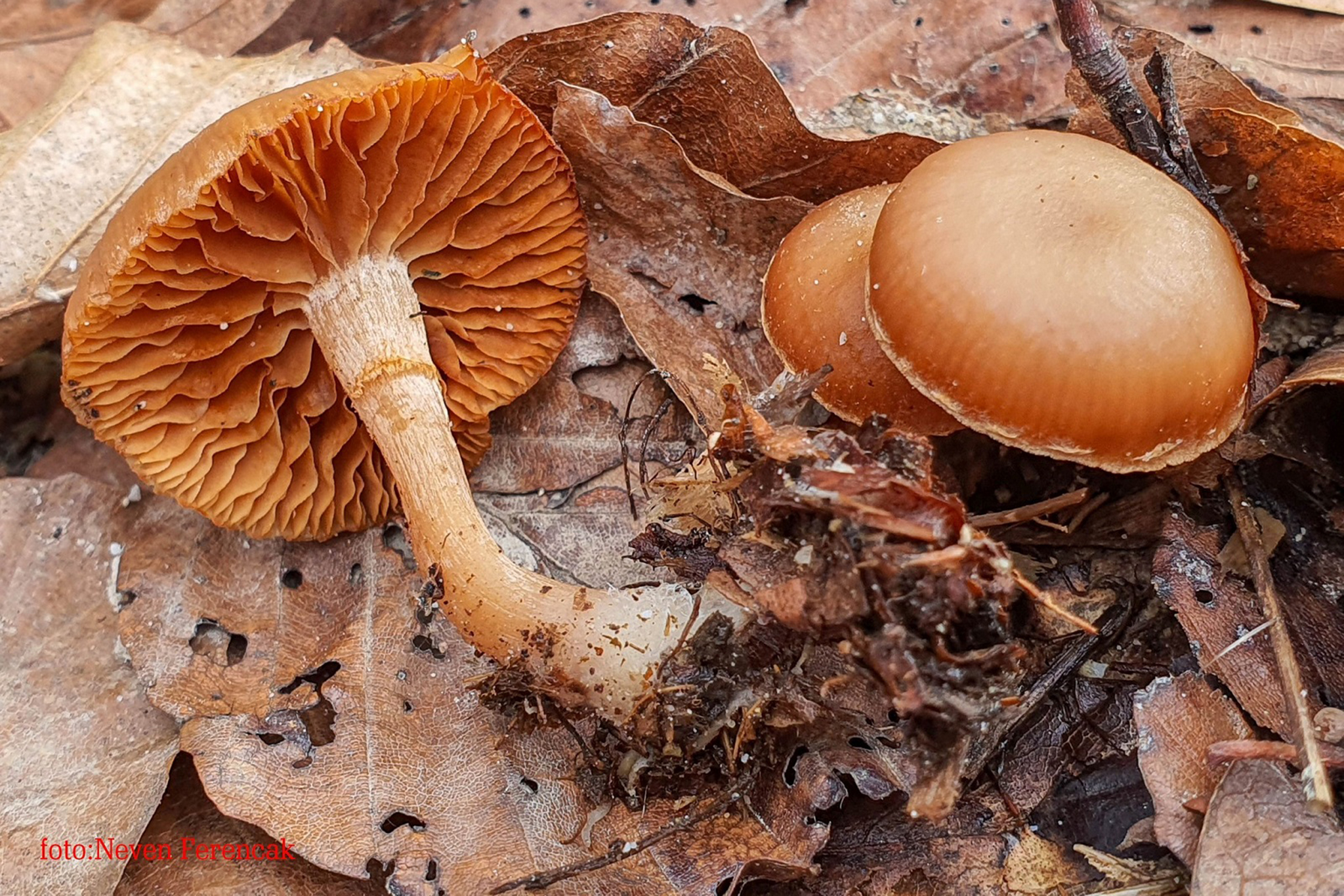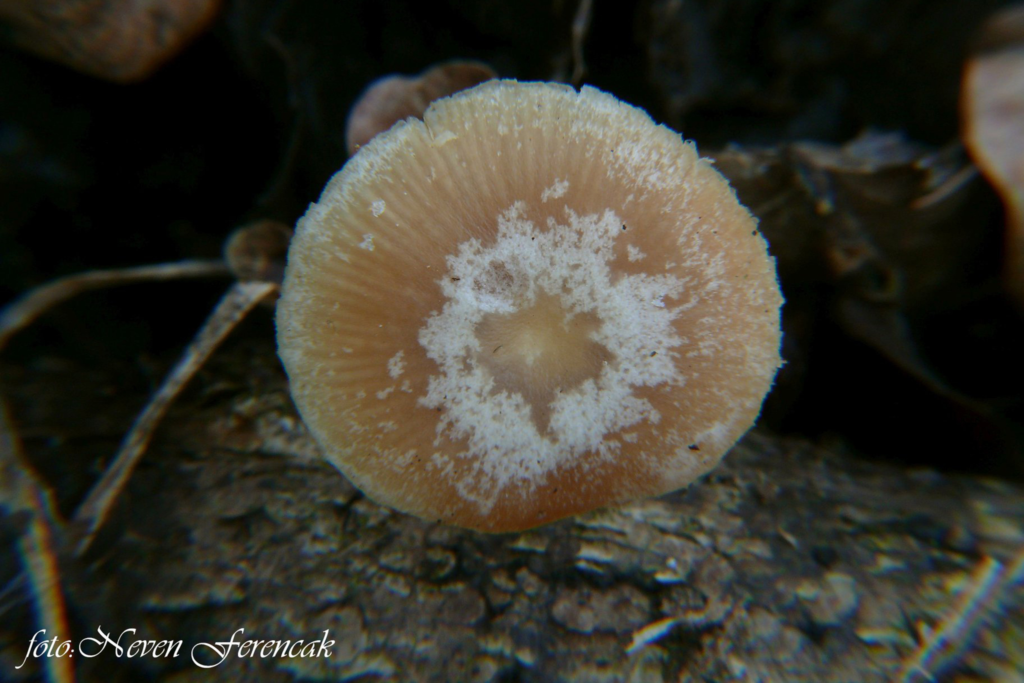 Etimologija: furfur (lat.) = mekinje, pjege. Po izgledu klobuka. Engleski naziv: Scurfy Twiglet Klobuk: 1-3.5 cm širok, prvo je konveksan, kasnije je raširen i malo ispupčen na sredini, vlažan, nije mazav, žuto-narančast, smeđ, narančasto-smeđ do crvenkasto-smeđ, vodenast, po suhom je vremenu bjelkasto-kremast, po vlažnom je vremenu je prozirno narebran, rub je svjetliji, prozirno je narebran, s mjestimičnim je svilenkasto ljuskavim ostacima bjelkastog ovoja. Stručak: 2-7 cm visok i 1-5 mm debeo, skoro je valjkast, u mladosti je pun, kasnije je šupalj, krut, često je stisnut, smeđ, bjelkasto je vlaknast na oker-smeđoj do crveno-smeđoj osnovi, na bazi je bijelo pahuljast od micelija, s više je ili manje izraženom prstenastom zonom. Listići: Razmaknuti, trbušasti, prirasli su ili se vrlo kratko spuštaju po stručku, izmiješani su s brojnim lamelulama, oker, smećkasti, narančasto-smeđi do crvenkasto-smeđi, oštrica je resasta, bijela i pilasta. Spore: Eliptične, glatke, prozirne, s tankim stijenkama, 6.5-10 x 4.5-6 µm, bazidije su batinaste, 4-sporne, s bazalnim kopčama, cheilocistide su batinaste do glavičaste, nepravilne, 18-35 x 5-9 µm, pileipelis se sastoji od paralelno raspoređenih hifa (cromushrooms: spores su (6) 6.5 - 8.3 (10.4) × (4) 4.3 - 5.2 (6.2) µm, Q = (1.3) 1.4 - 1.7 (1.9), N = 400, Me = 7.3 × 4.8 µm, Qe = 1.5, bazidije su 27-37 × 5.4-8.3 µm, N = 36, cheilocistide su 21-58 × 6.1-10.8 µm, N = 19, hife trame listića su široke 4.6-19.4 µm, vršni segmenti su 45-90 × 10.6-27.4 µm, N = 12, hife su s kopčama); otrusina je oker-smeđa do hrđastosmeđa, ponekad izgleda žuto-zelenkasta ili svijetlosmeđa. Meso: Tanko, svijetlosmeđe, crvenkasto-smeđe, vodenasto; miris nije izražen ili je slab na gljive, rijetko na rotkvice, a okus je na gljive i rotkvice, ljut, rijetko je neugodan i malo užegli. Stanište: Raste tijekom godine, zimi i pod snijegom, kao saprofit na krupnijim drvnim ostacima raznog bjelogoričnog drveća, te prividno na na zemlji izmiješanoj s drvnim ostacima. Sve slike snimio je Neven Ferenčak, prve dvije 21.12.2025., na lokalitetu Klenovnik kod Ivanca, četvrtu i petu 13.2.2020., na lokalitetu kod Varaždina, a ostale 31.1.2020., na lokalitetu Dravska park šuma u Varaždinu. Doba rasta: 1, 2, 3, 4, 5, 6, 7, 8, 9, 10, 11, 12 Status jestivosti: NEJESTIVA - Nema vrijednosti. Napomena: Pripada skupini gljiva malih rastom iz roda Tubaria koje su jednolične oker-smeđe ili sivkaste boje. Ova vrsta je s karakterističnim lijevkastim oblikom i listićima koji se spuštaju po stručku. Ove karakteristike nisu uvijek uočljive, te je potrebno veliko iskustvo pri determinaciji ove vrste. Jedina sigurna metoda za determinaciju je mikroskopska analiza.