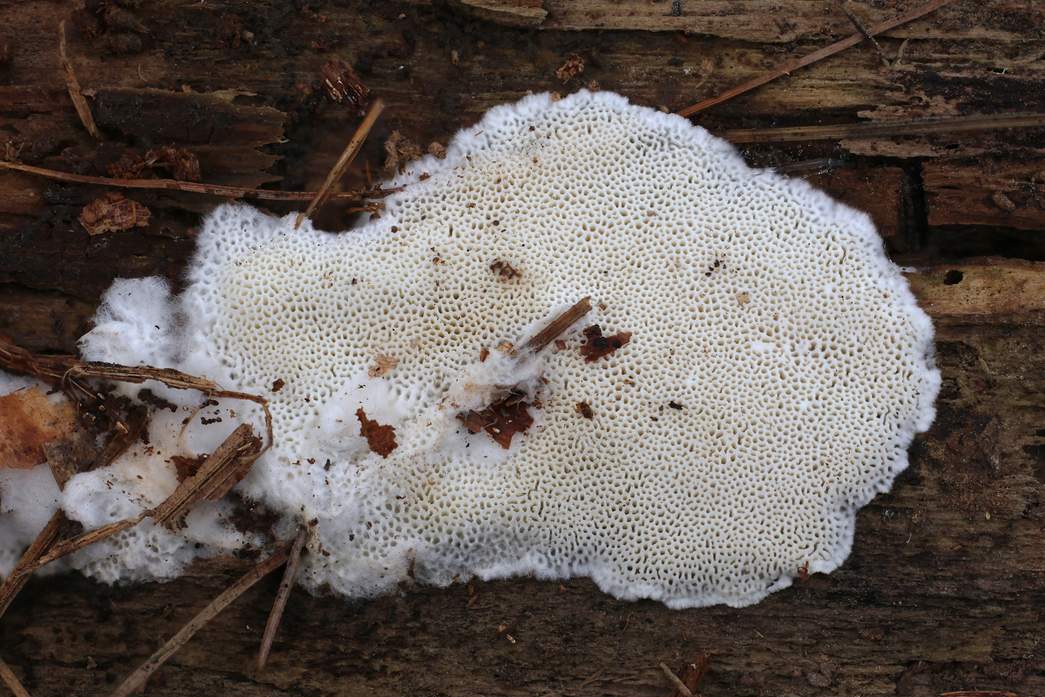 Etimologija: album (lat.) = bijelo + brunneus (lat.) = smeđe. Po kontrastu između bijelih rupica i smeđih cjevčica. Plodno tijelo: 3-40 cm široko i 1-18 mm debelo, posve prileglo na supstrat, razrašteno, formira plahtice, ponekad je većih dimenzija jer je više plodnih tijela zajedno spojeno; himenijalna je površina bijela do bijelo-sivkasta, zatim je krem do sivkasto-smeđa, često je s diskoloriranim cimetastosmeđim mrljama, po suhom je vremenu jednoličnije smeđa, u starosti je cimetastosmeđa, rub je pamučasto-dlakav, bijel, kasnije je smećkast do hrđastosmeđ. Rupice/cjevčice: Okruglaste, višekutne, 3-5/mm2, ponekad izduženi i šire, promjera do 1 mm, u samom subkulumu i na rubu, poslije su duguljasto-rascijepljene; cjevčice su 1-3 mm duge, najprije su bijele, kasnije su jednolično svijetlosmeđe. Spore: Valjkaste, glatke, prozirne, 4-8.5 x 1.3-2.4 µm, Q = 3-3.8 (cromushrooms: (4.6) 5 - 6.5 (7.5) × (1.3) 1.4 - 2 (2.3) µm, Q = (2.8) 3 - 4 (4.2), N = 60, Me = 5.9 × 1.7 µm, Qe = 3.5); otrusina je bijela. Meso: Tanko, mekano, po suhom je vremenu žilavo, bjelkasto; miris je cvijetni, na suhe jabuke, a okus je blag. Stanište: Raste tijekom godine kao saprofit krupnijih drvnih ostataka različitog crnogoričnog drveća s korom koji su izloženi suncu, obično jele, ariša, smreke, ili bora. Vrlo je rijetka vrsta. Slike su snimljene 11.3.2026., na lokalitetu Brlenić kod Krašića, na trupcu bora. Doba rasta: 1, 2, 3, 4, 5, 6, 7, 8, 9, 10, 11, 12 Status jestivosti: NEJESTIVA - Nema vrijednosti. Napomena: Po pamučastoj rubnoj zoni i rupičastoj himenijalnoj površini slična je svilenasta koroporka (Anomoporia bombycina). Referentni izvori: Božac, Romano. 2008. Enciklopedija gljiva, 2. svezak. Školska knjiga. Zagreb. – 1312. Antrodia albobrunea (Romell) Ryv. Skeniraj QR kod za brzi pristup ovoj vrsti na svom mobitelu.