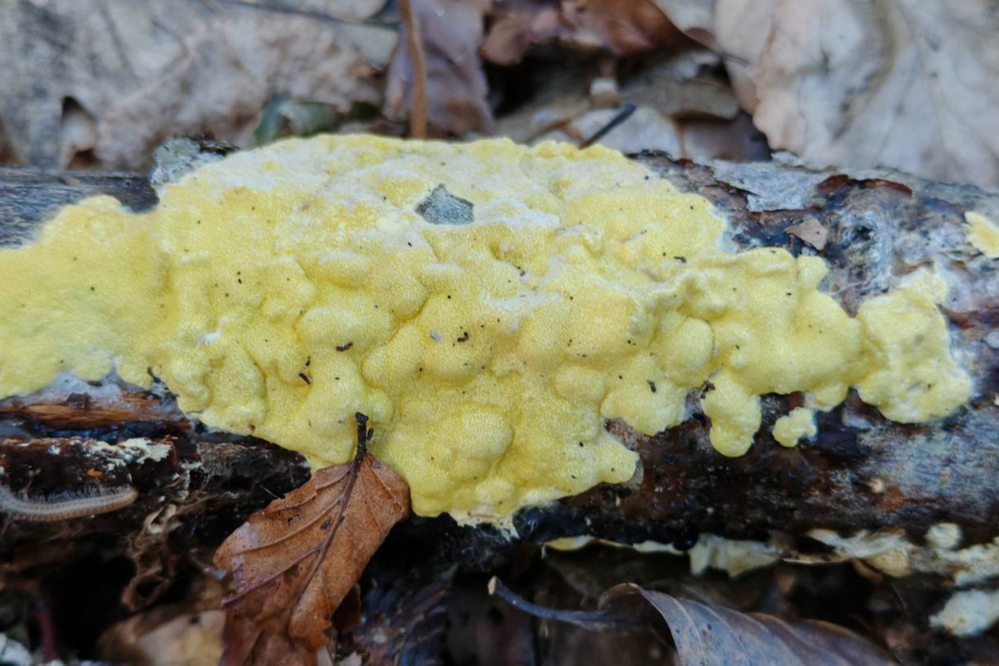 Etimologija: sulfur (lat.) = sumpor. Po boji. Plodno tijelo: 3-7 (>10) cm široko, u obliku je nepravilnih jastučastih plahtica; površina je neravna i kvrgava, svijetložuta, limunastožuta ili žuto-zelena s pravilno raspoređenim gustim tamnijim točkicama peritecija, rub je vrlo nepravilan i vijugav ili režnjast te oštro odvojen od supstrata. Spore: Eliptične, najprije glatke, kasnije postanu točkaste, prozirne, 4-8.5 x 4-7.5 µm; otrusina je bijela. Meso: Žućkasto, više je ili manje želatinozno; miris i okus nisu izraženi. Stanište: Raste u proljeće, ljeto i jesen kao parazit i saprofit na krupnim drvnim ostacima različitog drveća bez kore, voli vlažna mjesta. Prve tri slike snimila je Helena Petrić, 15.5.2025., a četvrtu i petu Anton Gračanin, 3.10.2025. Doba rasta: 5, 6, 7, 8, 9, 10, 11 Status jestivosti: NEJESTIVA - Nema vrijednosti. Napomena: Opisana se mješinarka ističe svojom sumporastožutom bojom. Zbog vrlo sličnog plodnog tijela se lako zamijeni s limunastom blazinicom (Trichoderma citrinum), koja ima limunastožuto plodno tijelo i vrlo nepravilan rub, a najčešće raste na otpalom lišću i sitnim grančicama pokrivajući tlo.