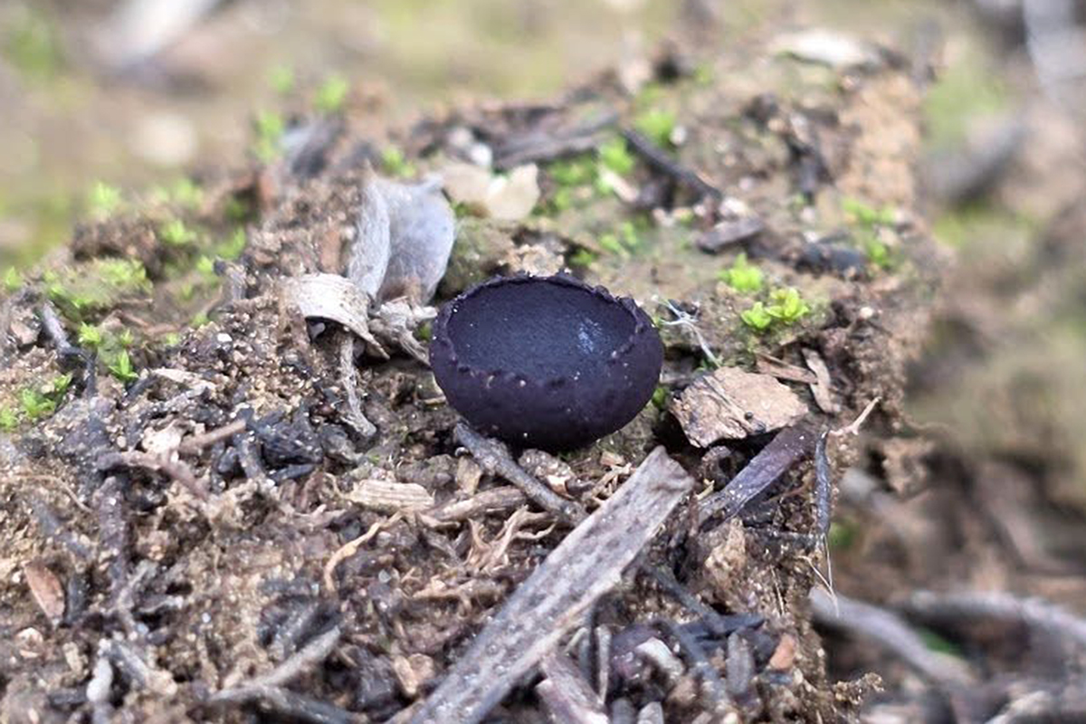 Etimologija: U čast francuskog botaničara Julesa Émilea Planchona (1823–1888). Po imenu. Plodno tijelo (apotecij): 0.5-2 cm široko, u mladosti je gotovo čašastog oblika, kasnije je pliće i nepravilno kuglasto i naborano, bez stalka, izravno je spojeno sa supstratom, unutarnja je himenijalna strana ljubičasta-crno do crna, glatka, sjajna po vlažnom vremenu, vanjska je strana crna, sitno bradavičava, rub je kasnije ponekad valovit, neravan i nazubljen. Spore: Kuglaste, glatke, u zrelosti su sitno bradavičave, s jednom ili više uljnih kapljica, prozirne, amiloidne, 9-12 µm, askusi su 8-sporni, 200 x 13-15 µm, parafize su batinaste, zakrivljene, s ljubičastim zrnatim sadržajem, do 6 µm široke na vrhu, duže su od askusa, ekscipulum se sastoji od kuglastih elemenata; orusina je ljubičasta. Meso: Tanko, u mladosti je elastično, kasnije je lomljivo, ljubičasto; miris i okus nisu izraženi. Stanište: Raste u proljeće, ljeto, jesen i zimu, pojedinačno ili u skupinama, kao saprofit tla, uz ceste i po dinama, na pjeskovitom tlu, u travi, preferira toplija staništa, obično u mediteranskim područjima. Sliku je snimila Ivana Mandić Mihaljević, 23.12.2025. Doba rasta: 5, 6, 7, 8, 9, 10, 11, 12 Status jestivosti: NEJESTIVA - Nema vrijednosti. Napomena: Prepoznatljiva je po čašastim do pločastim apotecijima tamnoljubičaste boje s nazubljenim rubom, sitno bradavičastom, tamnoljubičastom do gotovo crnom vanjskom stranom, mikroskopskim karakteristikama i rastu na pjeskovitom tlu.
